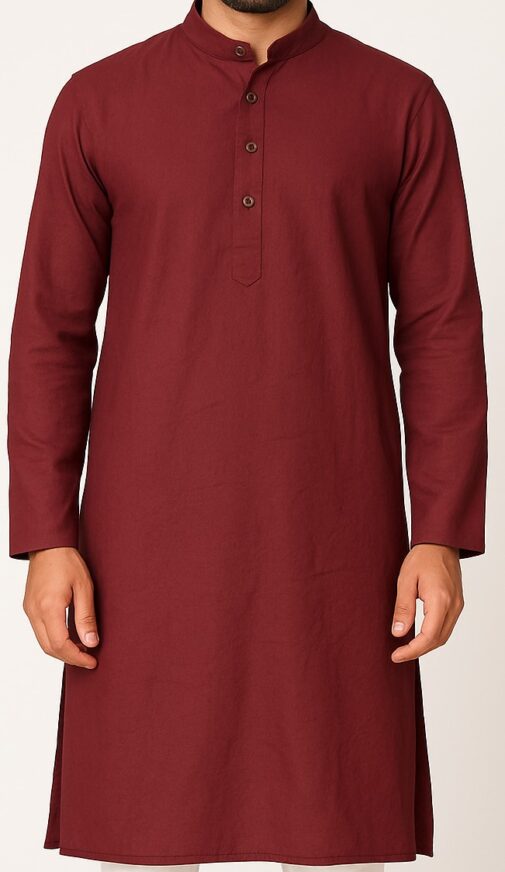 Men’s maroon cotton kurta with mandarin collar, button placket, and full sleeves. Solid pattern with side slits for comfort and style.