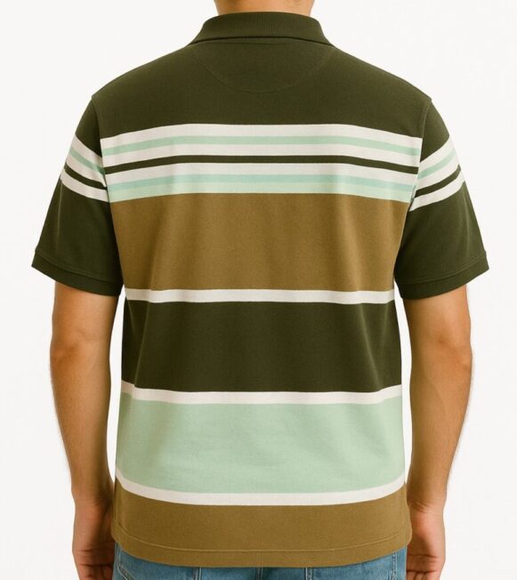 Elevate your casual wardrobe with this men's polo t-shirt featuring a stylish combination of olive green, brown, mint green, and white horizontal stripes. Made from premium cotton-blend fabric, this polo offers a comfortable fit with a classic spread collar and two-button placket. The half sleeves and straight hem add to the relaxed silhouette, making it perfect for everyday wear. Pair it effortlessly with jeans or chinos for a smart-casual look.