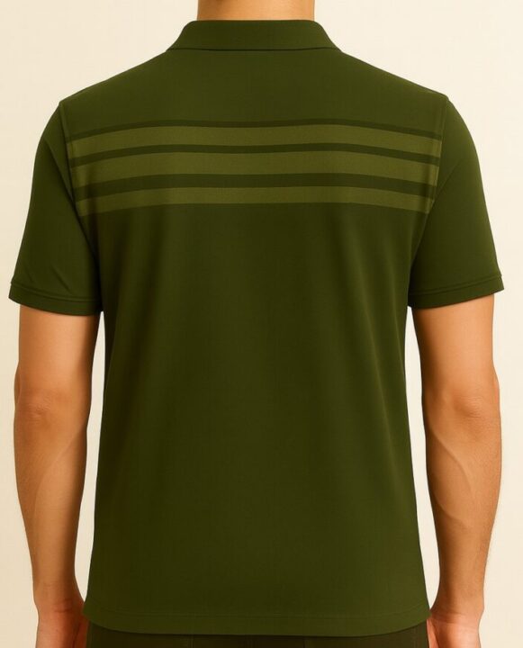 Men’s Olive Green Striped Polo T-Shirt   This men’s polo t-shirt comes in a rich olive green shade with a stylish horizontal stripe pattern across the chest and back. Designed with a classic polo collar, three-button placket, and a front pocket for a casual yet polished look. The short sleeves and soft cotton-blend fabric ensure comfort and breathability, making it perfect for both casual outings and semi-formal settings.