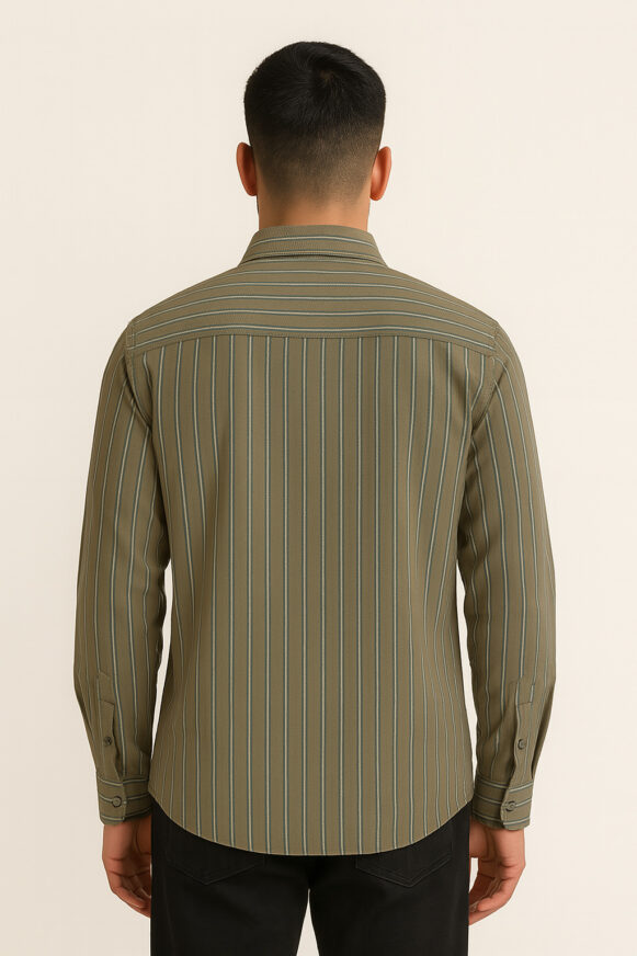 Men’s Olive Green Striped Shirt, Men’s full-sleeve olive striped shirt with chest pocket and classic collar in breathable cotton.