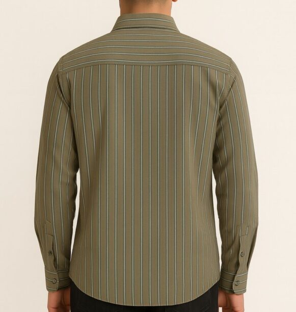 Men’s Olive Green Striped Shirt, Upgrade your wardrobe with this full-sleeve men's casual shirt in an elegant olive green tone. The shirt features vertical blue and beige stripes, giving it a clean, sophisticated look. Crafted from soft cotton fabric, it includes a classic spread collar, a front button placket, a left chest pocket, and a curved hemline for a flattering fit. The back panel is plain with horizontal stripe yoke detailing for added design interest. Ideal for both work and weekend outings.