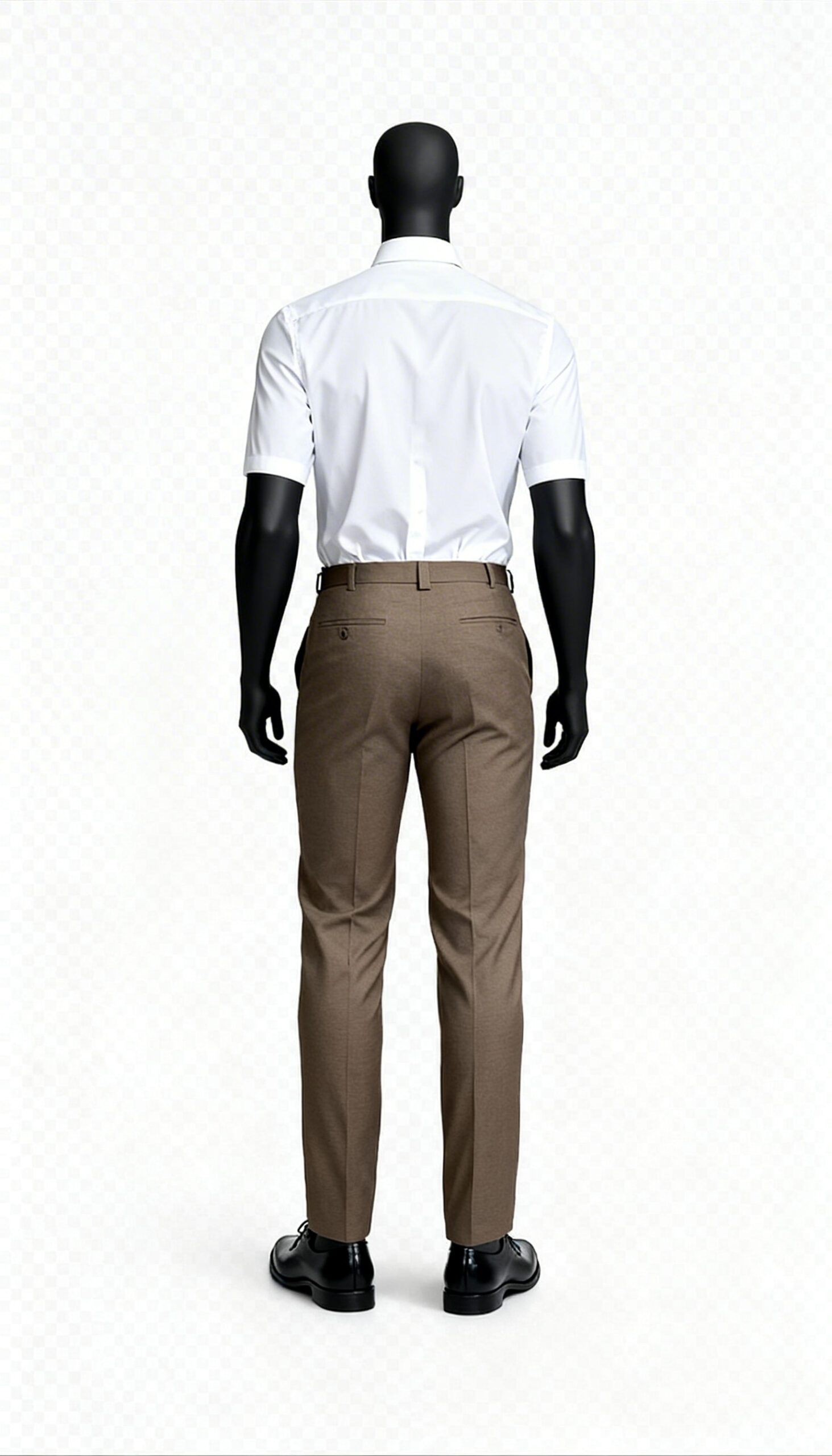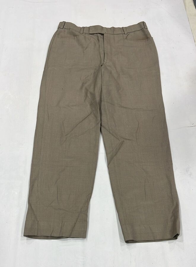 Clean taupe formal trousers with flat front, belt loops, straight-leg cut, minimal detailing.