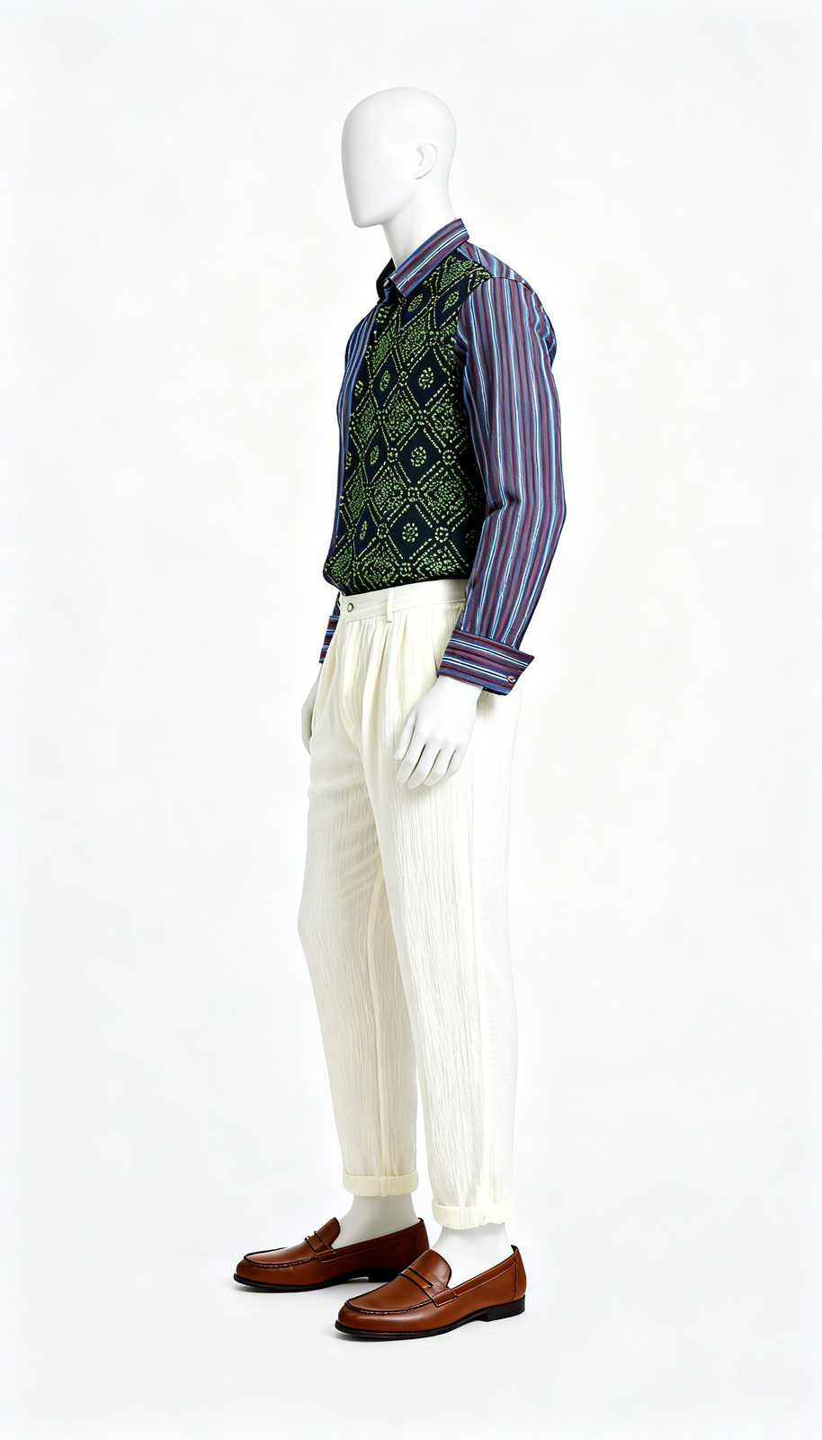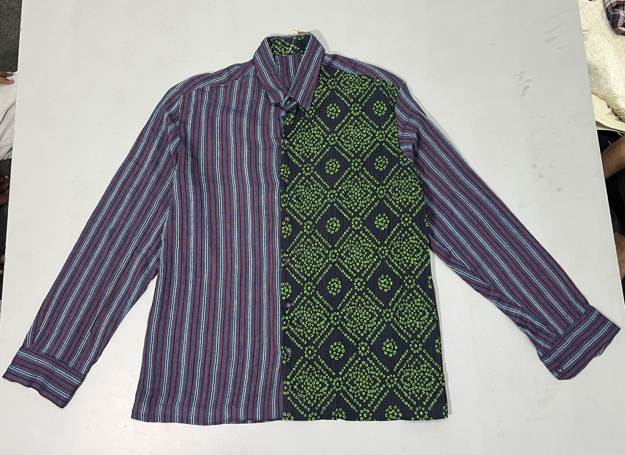 Multicolor Panel Casual Shirt (Worn by Kartik Aaryan in Satyaprem ki Katha by Namah Pictures) Multicolor Panel Casual Shirt blends striped and geometric printed panels into a statement contemporary silhouette. Crafted in breathable cotton, it features a collared neck and button closure for structured appeal. Full sleeves provide versatility for daily styling while the straight hemline maintains balanced proportion. Its bold contrast palette reads clean in wide shots and remains statement wear ready. Designed for modern wardrobes, it supports repeat wear with durable practicality.