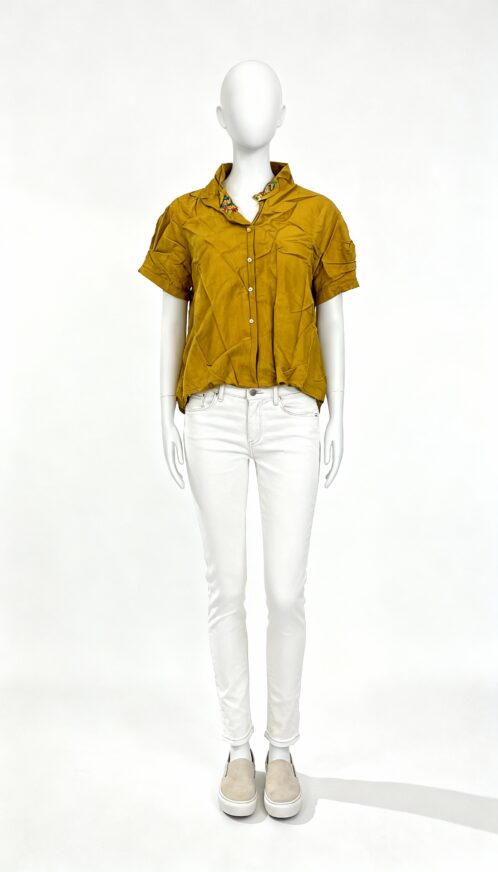 Mustard Button-Down Shirt, A relaxed-fit mustard shirt featuring short sleeves and elegant beaded detailing near the collar. Lightweight, stylish, and perfect for casual or semi-formal wear.