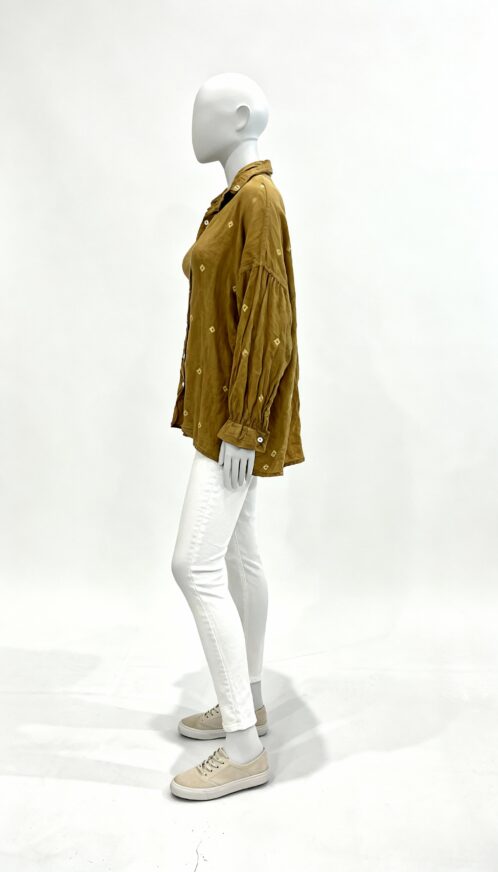 This mustard button-down shirt features a lightweight, airy fabric with small embroidered diamond motifs throughout. Designed in an oversized, relaxed silhouette with long sleeves and a classic collar—perfect for casual, everyday comfort with a touch of handcrafted charm.