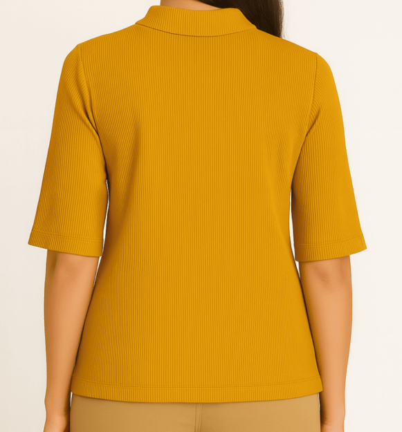 Mustard Half Sleeve Knit Top This mustard yellow ribbed knit top offers a blend of comfort and modern style. Featuring a structured mock neck and half sleeves, it provides a neat, tailored look with subtle vertical ribbed texture. Made from stretchable fabric, this slim-fit top contours the body gracefully, making it perfect for casual outings or layering under blazers. The solid back and clean hemline complete the minimal yet chic design.