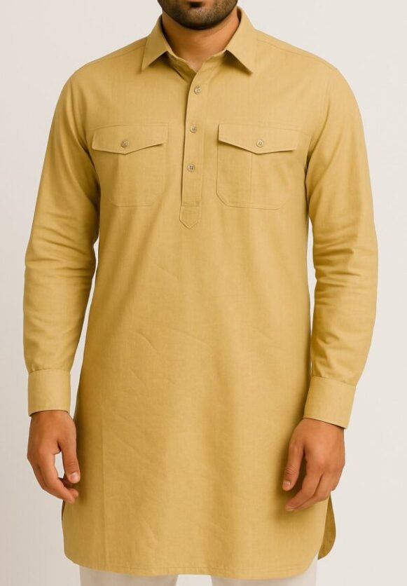 Mustard Yellow Flap-Pocket Kurta, Mustard yellow cotton kurta for men with dual flap pockets, shirt collar, and full sleeves. Ideal for traditional or everyday ethnic looks.