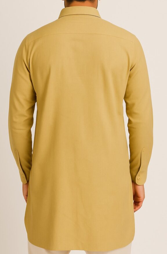 Mustard Yellow Flap-Pocket Kurta, This men's mustard yellow kurta offers a blend of classic style and modern comfort. Crafted from breathable cotton fabric, it features a structured shirt collar, front half-button placket, and two symmetrical flap pockets on the chest, each secured with a button. The full-length sleeves come with buttoned cuffs, while the back remains minimal for a sleek look. The straight hem adds a clean finish, ideal for both casual and festive wear. Pair it with white or beige trousers for a refined ethnic appearance.