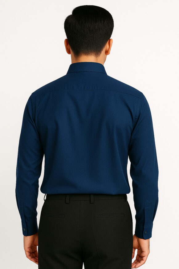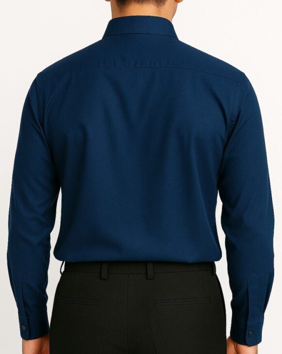 Elevate your formal wardrobe with this elegant midnight blue shirt, crafted from a smooth, durable cotton-blend fabric. Featuring a classic pointed collar, front button-down placket, and a functional chest pocket, this shirt is tailored for both comfort and professionalism. The long sleeves with buttoned cuffs and regular fit offer a timeless silhouette suitable for business meetings or refined casual looks. The back panel is clean and minimal, enhancing the shirt’s sophisticated appeal.