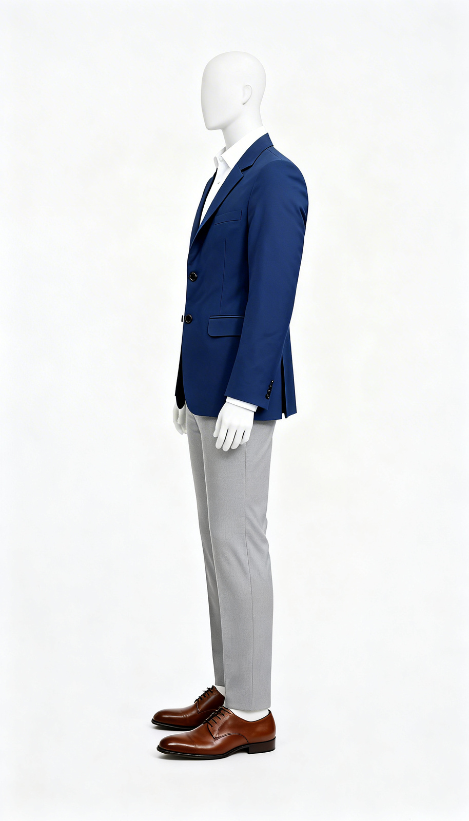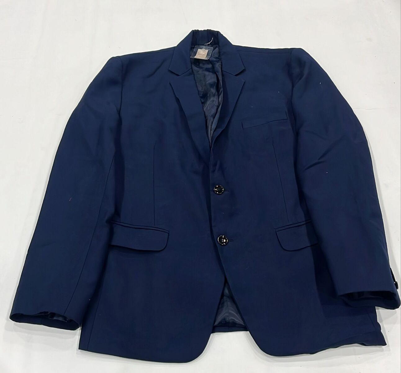 Navy blue two-button blazer with notch lapel, structured shoulders and smooth inner lining for corporate and formal wear.