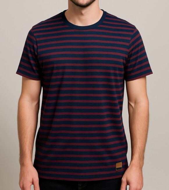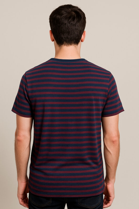 Navy-Maroon Striped Tee Navy-Maroon Striped Tee This men’s short-sleeve T-shirt features a timeless navy blue and maroon horizontal stripe pattern. Crafted from soft, breathable cotton fabric, it offers a relaxed fit with a classic crew neck and short sleeves. A small faux leather brand tag near the hem adds a minimal touch of branding. Perfect for everyday casual wear, the tee ensures both style and comfort. The design is clean on the back, with matching stripe alignment throughout.