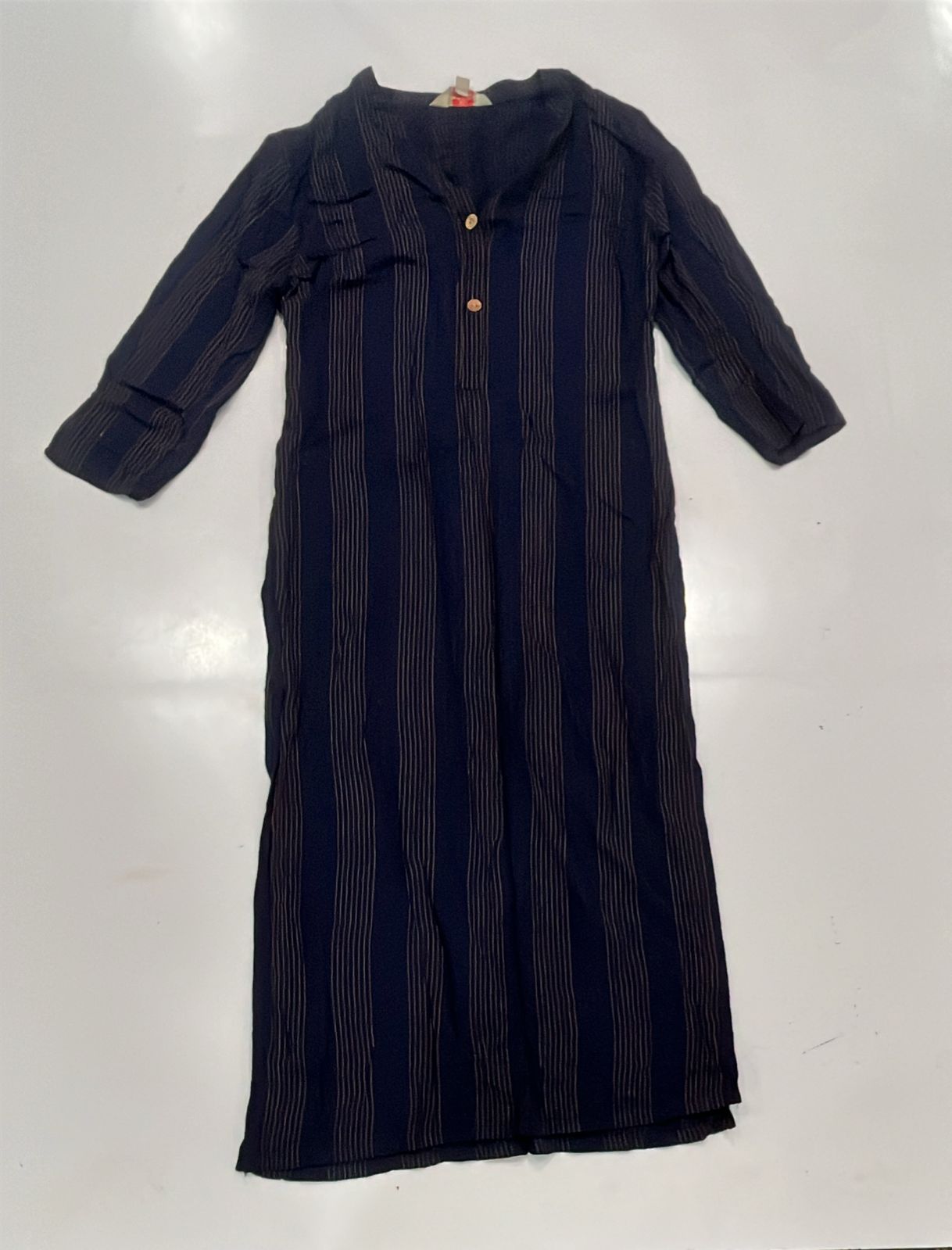 Navy Striped Cotton Kurta This elegant navy blue kurta features vertical pinstripes in a subtle beige tone, offering a refined ethnic look. It comes with a band collar, a front half placket with wooden buttons, and three-quarter sleeves. The breathable cotton fabric ensures comfort for daily wear. The kurta is calf-length and designed in a relaxed straight fit, making it ideal for workwear or casual gatherings. The back mirrors the front stripe pattern with a clean, uninterrupted fall.
