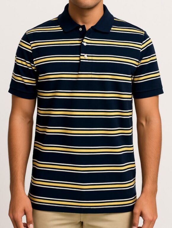Navy Striped Polo T-Shirt, This navy blue polo T-shirt features bold horizontal stripes in yellow and white, offering a classic yet energetic look. Made from a soft cotton-blend fabric, it ensures breathable comfort throughout the day. Designed with a standard polo collar and a three-button placket, it combines timeless style with everyday ease. The short sleeves are finished with ribbed cuffs, enhancing the structured silhouette. Ideal for casual outings or semi-casual occasions, this tee pairs effortlessly with chinos, jeans, or shorts.