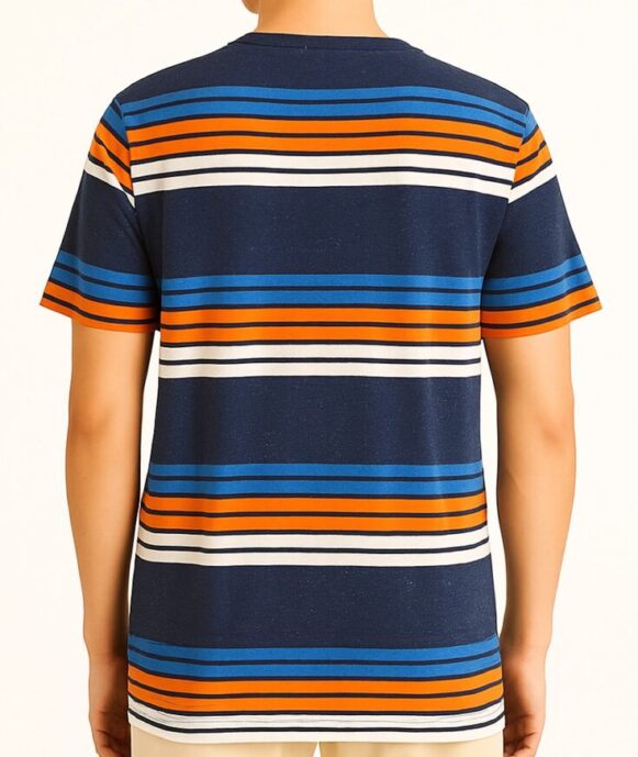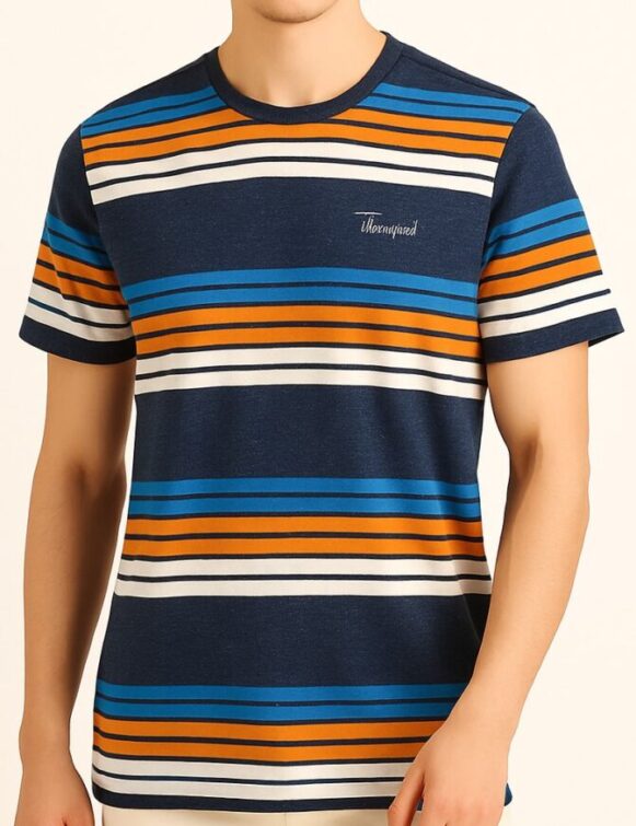 This men’s navy T-shirt is designed with vibrant horizontal stripes in white, orange, and shades of blue, giving it a fresh, sporty appeal. Featuring a classic crew neckline and short sleeves, the tee provides a comfortable, regular fit for everyday wear. The fabric has a soft hand feel and smooth finish, making it ideal for both casual outings and relaxed weekends. The left chest showcases a subtle embroidered text: “Unconquered,” adding a touch of attitude to the minimal design.