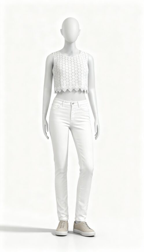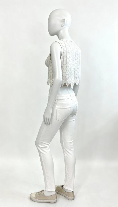 This sleeveless lace crop top is designed to highlight delicate detailing with a refined and feminine touch. Featuring a floral textured surface, the intricate lace pattern adds depth and elegance to the overall design. The floral motifs create a soft visual appeal that enhances the garment’s charm without overwhelming its minimal silhouette. Its sleeveless cut keeps the look fresh and modern, drawing attention to the shoulders and neckline while maintaining a balanced structure.