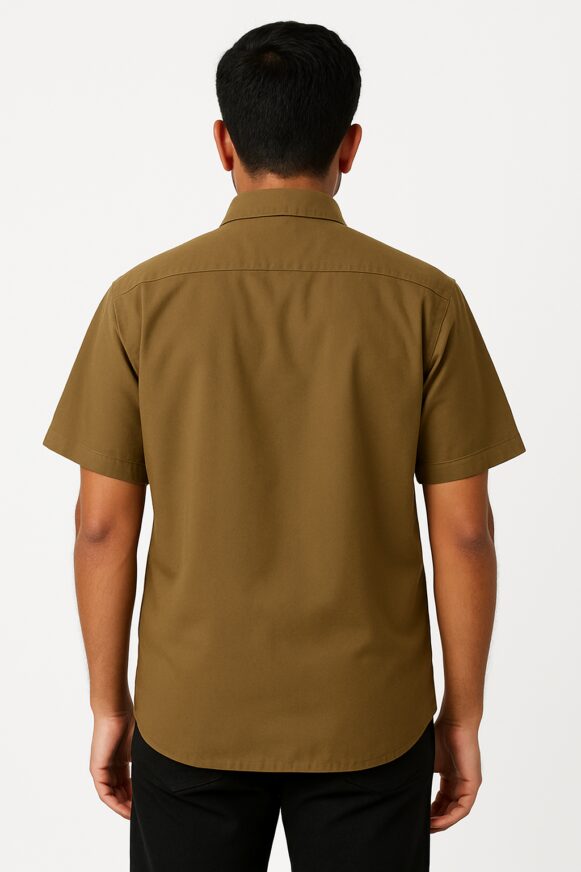 This men's short sleeve shirt in olive brown is a versatile and timeless wardrobe essential. Crafted from a durable cotton-blend fabric, the shirt features a classic button-down front, pointed collar, and a single chest pocket for added functionality. The tailored fit enhances the silhouette while providing comfortable wear throughout the day. Ideal for both casual and semi-formal occasions, this shirt pairs effortlessly with jeans or trousers.