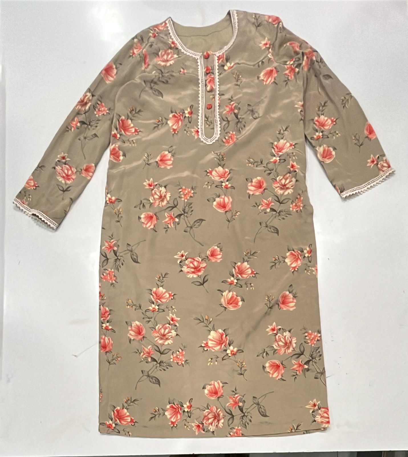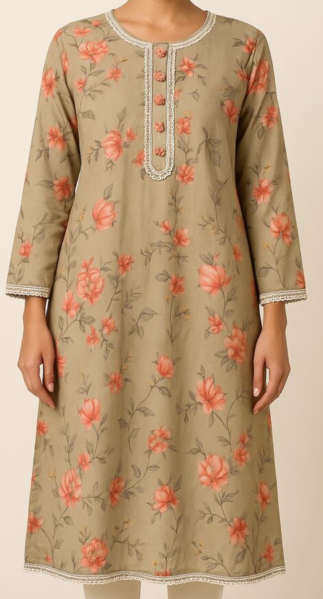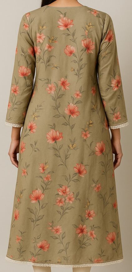 Bring elegance to your everyday wear with this olive green A-line kurta, adorned with charming floral prints in coral red and peach tones. The kurta features full-length sleeves and is beautifully detailed with cream crochet lace along the round neckline, placket, sleeve cuffs, and hemline. The fabric drapes gracefully in a flared silhouette, giving a soft and feminine appeal. A front buttoned placket with fabric-covered buttons adds a touch of traditional style. Pair it with leggings or churidar pants for a complete ethnic look.