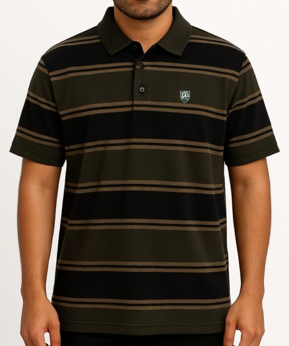 Olive Green and Black Striped Polo T-shirt, Men’s olive and black striped polo T-shirt with chest logo and comfortable fit.