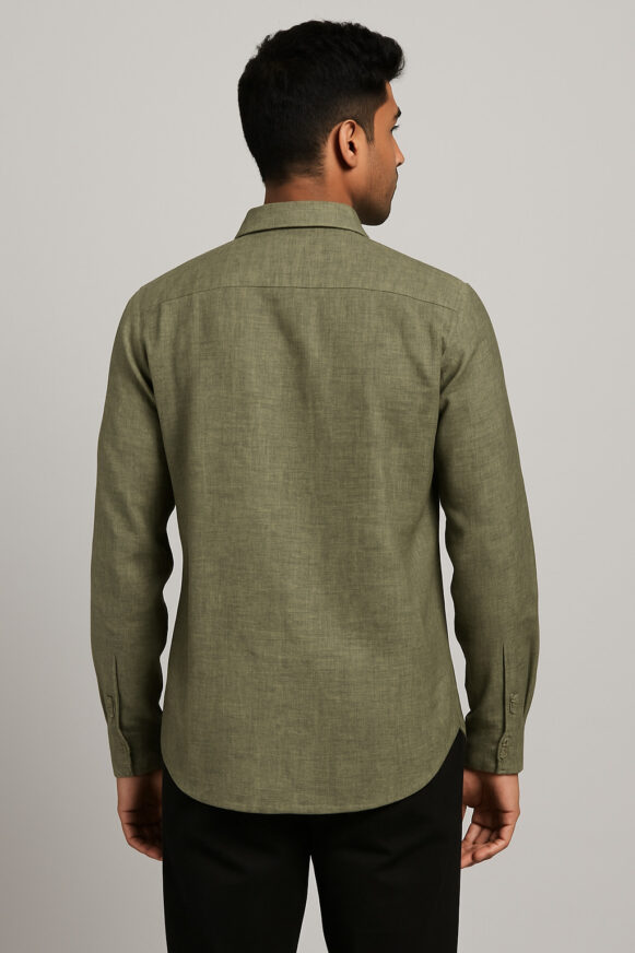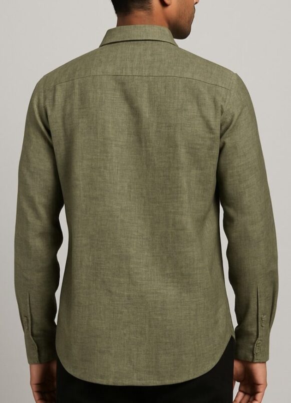 Olive Green Full-Sleeve Textured Cotton Shirt, This olive green full-sleeve shirt is made from premium lightweight cotton with a soft, textured weave. Designed for all-day comfort, it features a button-down front, a structured collar, and a practical chest pocket with sharp stitch detailing. The fabric has a sophisticated texture with a muted cross-weave appearance, making it ideal for both smart-casual and semi-formal settings.