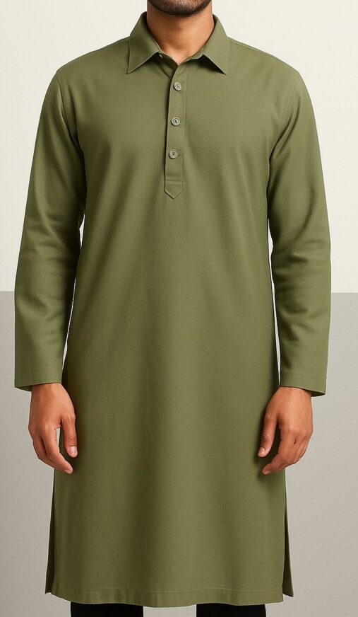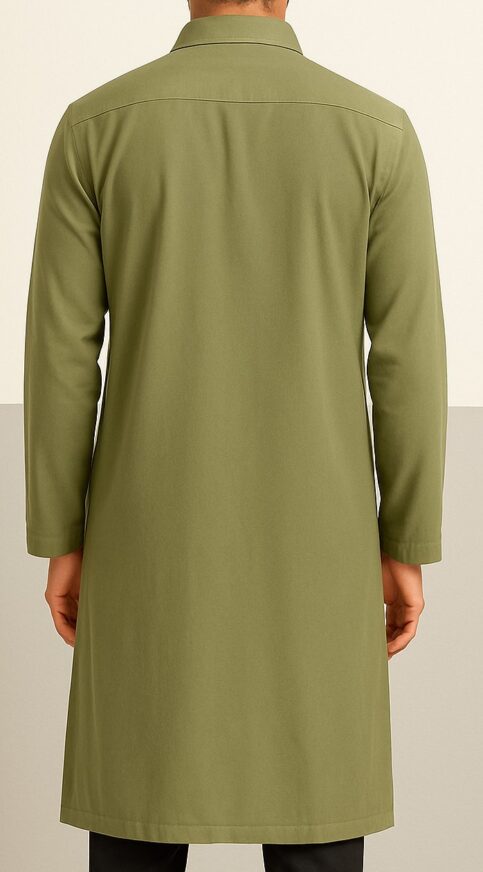 Olive Green Men's Long Kurta, Step into subtle sophistication with this olive green long kurta crafted from smooth, breathable fabric. Featuring a sharp shirt-style collar and a three-button placket with pointed end detailing, this kurta is tailored for both casual and semi-formal wear. The straight-cut silhouette is complemented by full-length sleeves and a minimal design at the back, making it a wardrobe essential for modern men who value comfort and elegance.