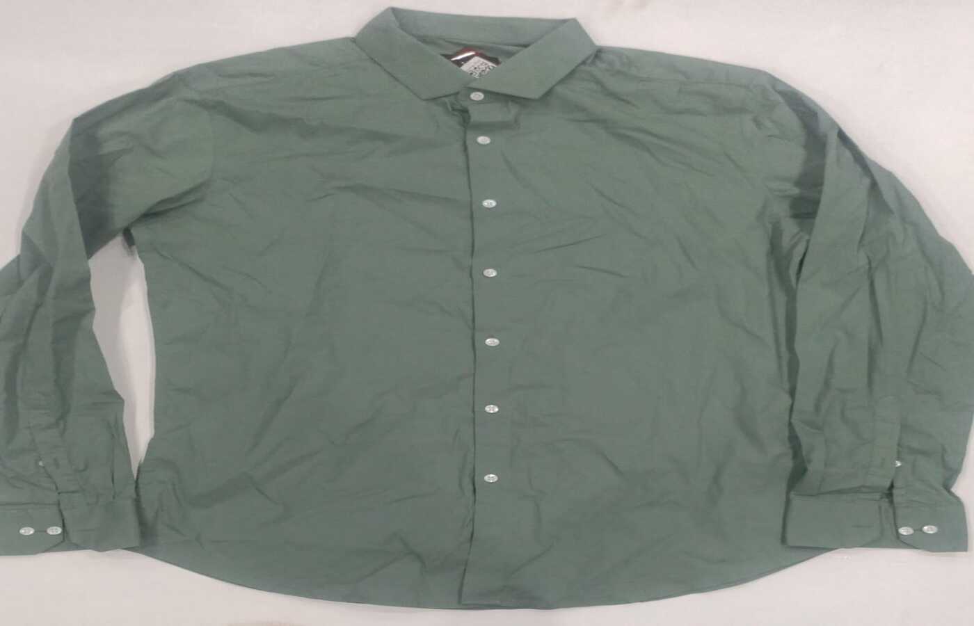 Olive green solid shirt made from soft cotton blend with front button closure and a crisp collar.