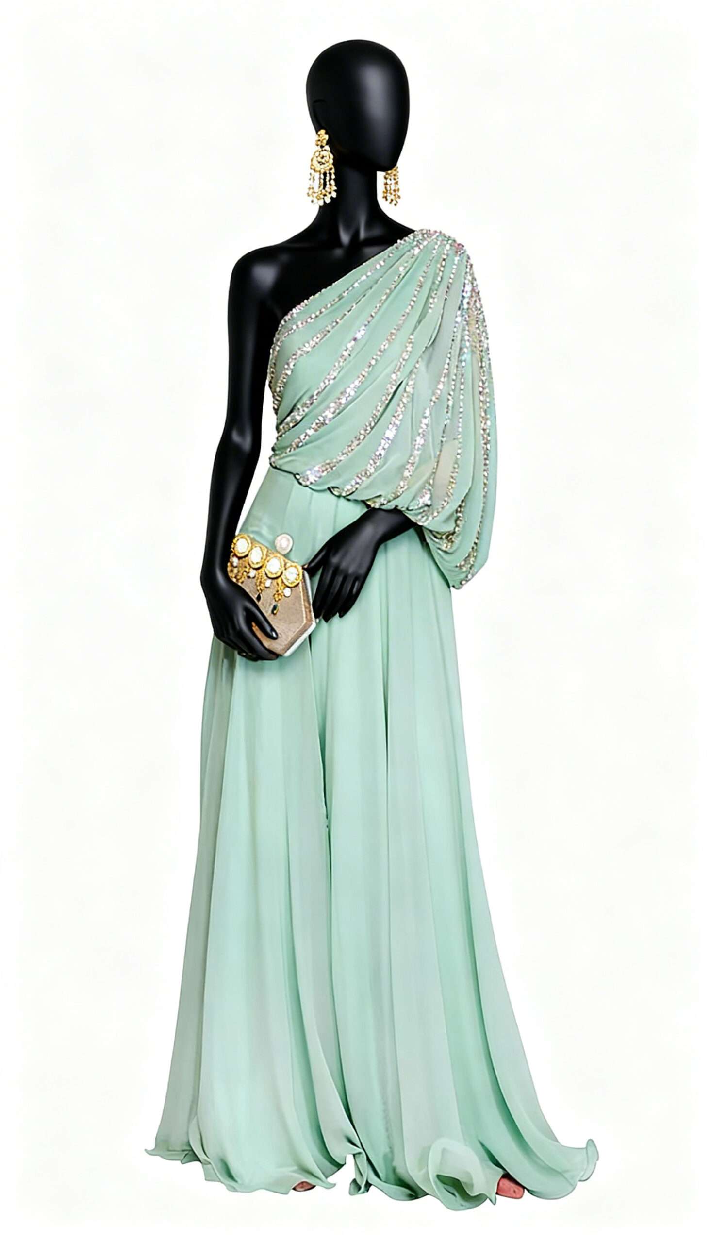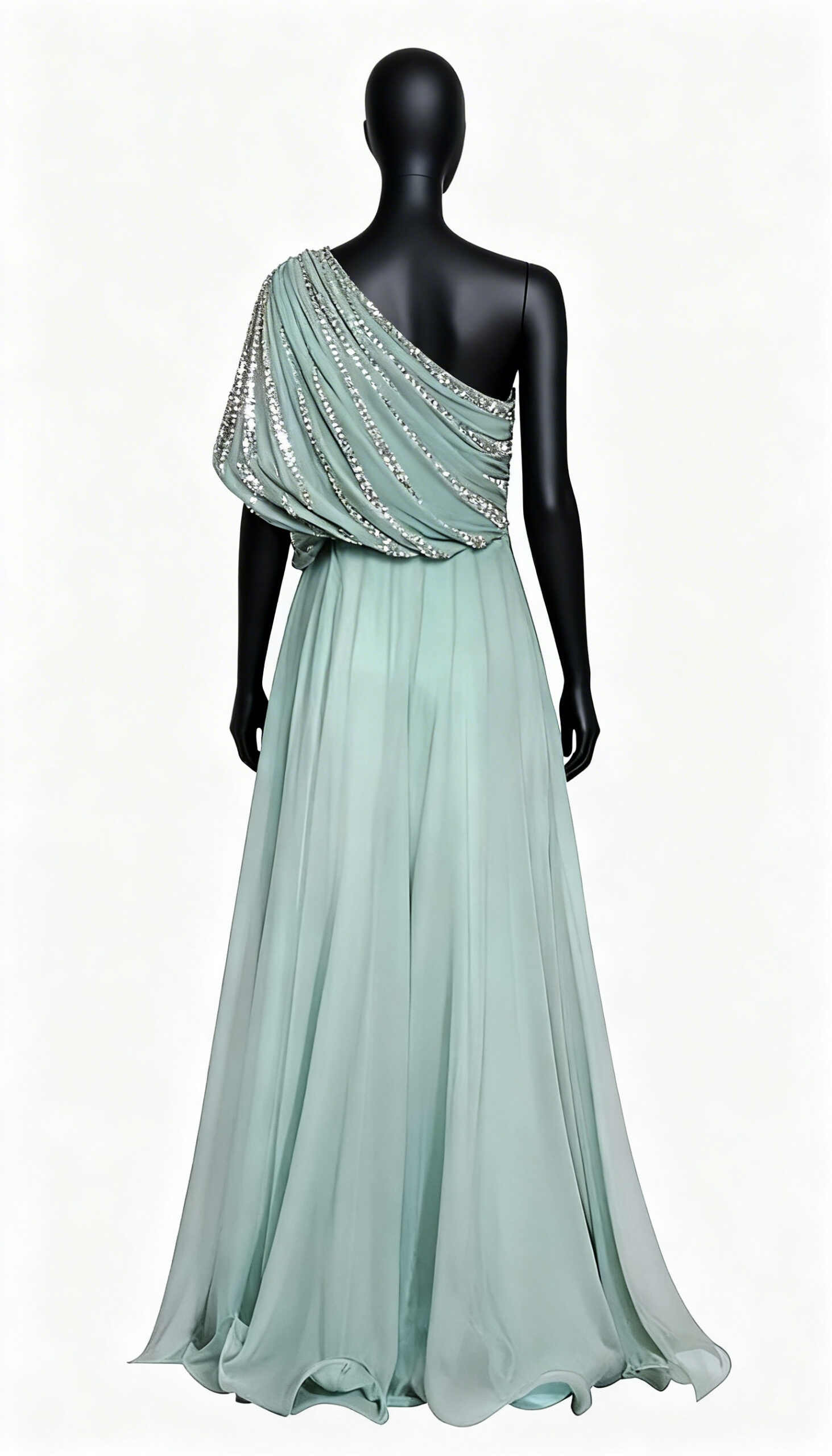 One Shoulder Western Dress, Sea Green One Shoulder Gown Modern one shoulder gown with graceful fall.