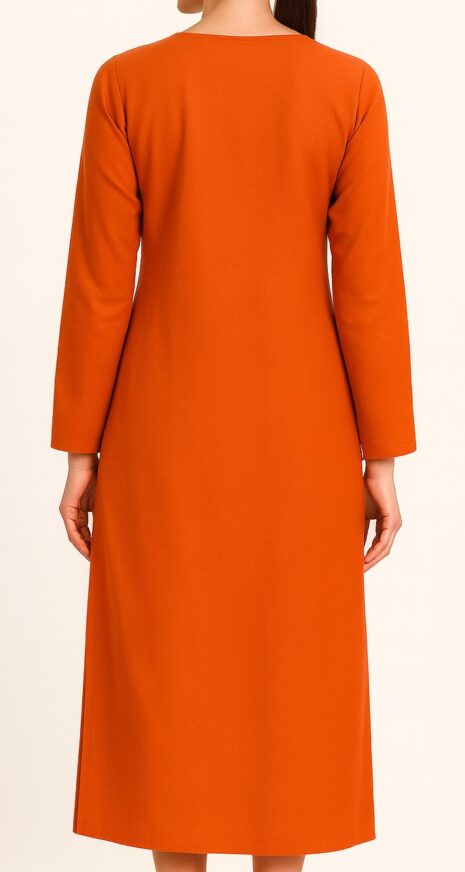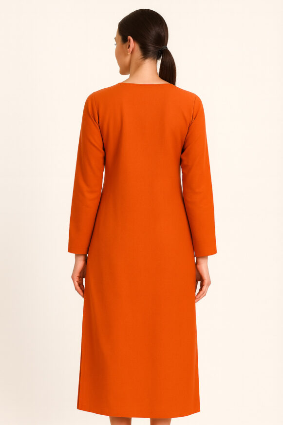 This women’s kurta is crafted from soft cotton fabric in a striking burnt orange shade. It features a beautifully embroidered neckline in contrasting white thread with intricate motifs forming a V-shaped pattern, adding elegance to the simple silhouette. The kurta comes with a straight cut, long sleeves, and side slits for comfort and ease of movement. Perfect for casual outings, office wear, or festive occasions, this kurta blends style with comfort effortlessly. Pair it with leggings, palazzos, or churidar for a complete look.