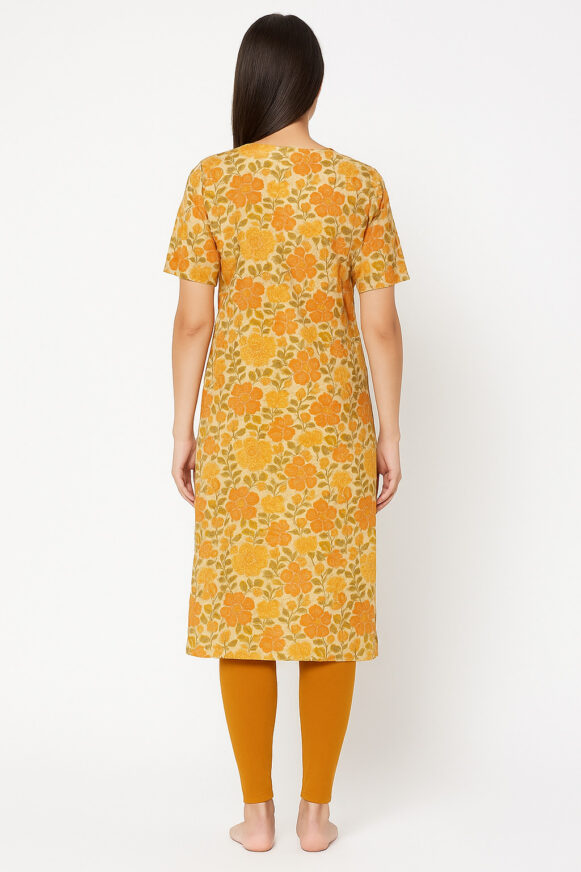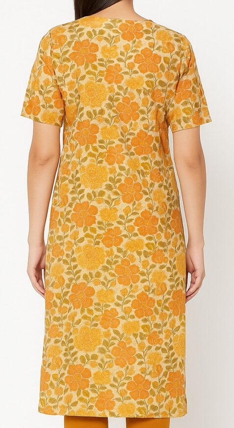 This elegant straight-fit kurta is crafted from breathable cotton fabric, designed for everyday comfort and style. Featuring an all-over floral print in warm mustard and orange tones with leafy accents, it brings a refreshing and vibrant touch to your wardrobe. The kurta comes with a round neckline and short sleeves, perfect for casual wear or small gatherings. Pair it with contrasting leggings or palazzos for a complete ethnic look.