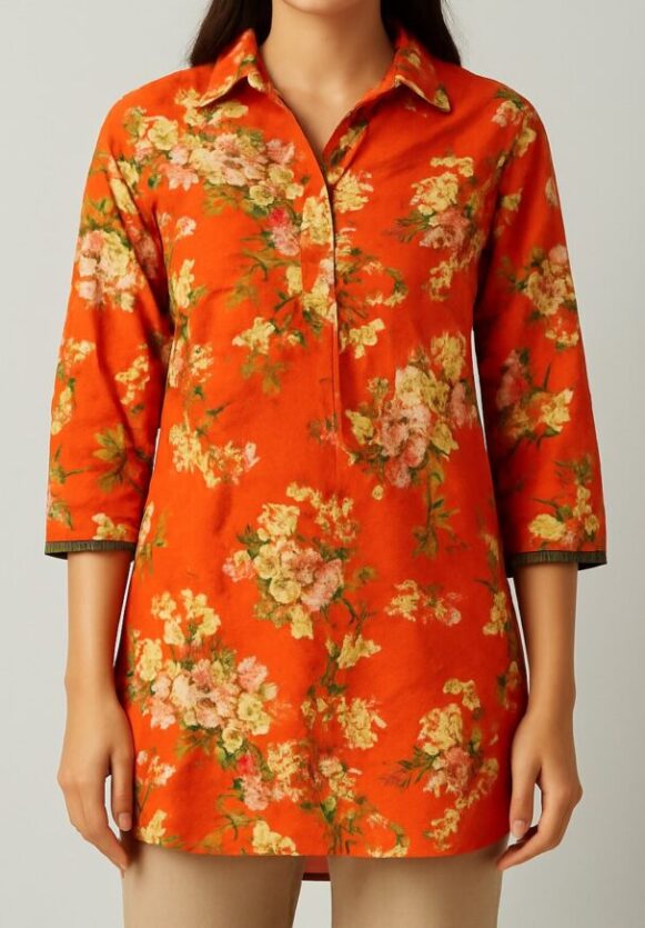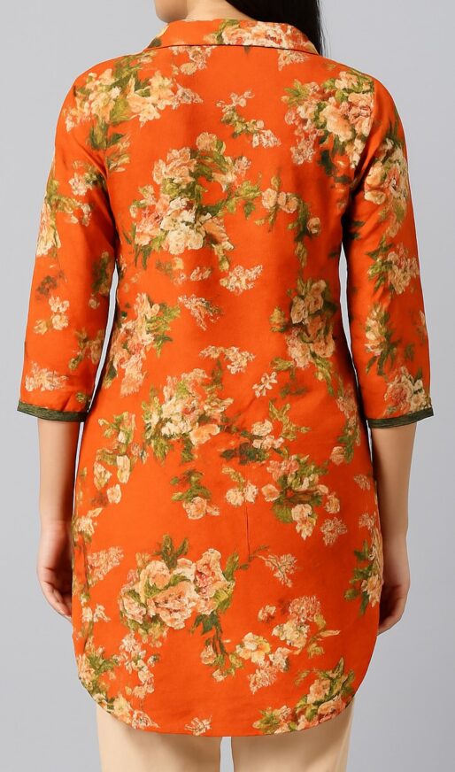 Infuse your wardrobe with vibrance through this eye-catching orange floral kurta. Designed in a straight silhouette with a shirt collar and a half placket, this kurta is adorned with painterly floral prints in pastel pink, yellow, and green hues. The 3/4th sleeves are finished with a subtle green trim for a neat accent. Crafted for comfort and everyday elegance, it's ideal for casual wear or semi-formal gatherings. The longer length and slightly curved hem offer flattering coverage and versatility for pairing with trousers or leggings.