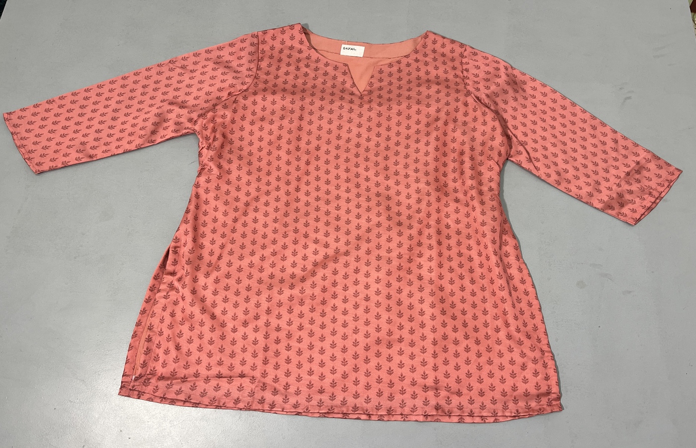 Peach Printed Kurti features subtle printed cotton fabric with three fourth sleeves suitable for formal office wear.