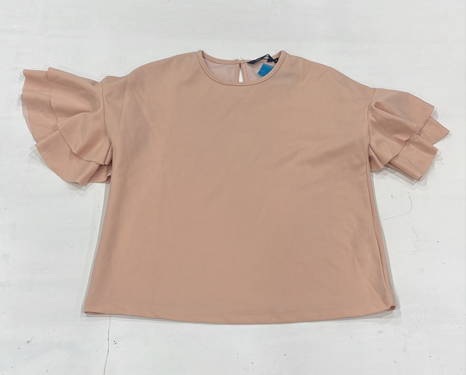 Soft peach top with layered ruffle sleeves.