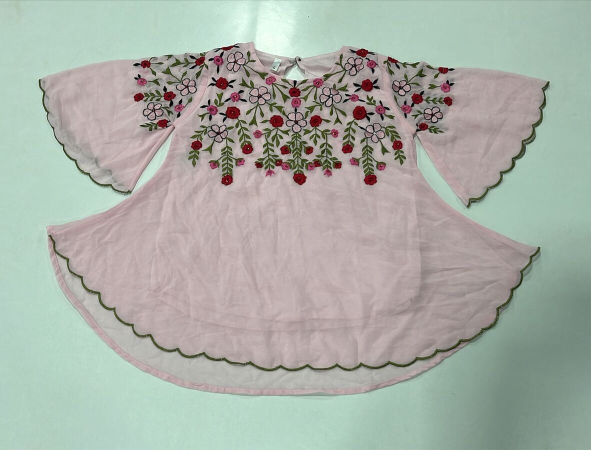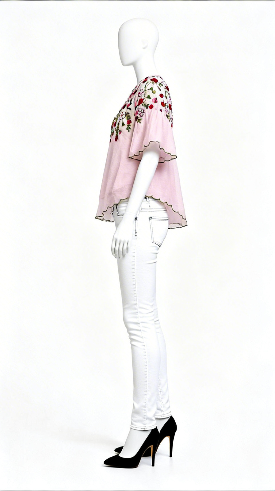 A pastel pink floral embroidered top featuring flared 3/4 sleeves, keyhole neckline, scalloped hemline and a flowy silhouette ideal for festive occasions