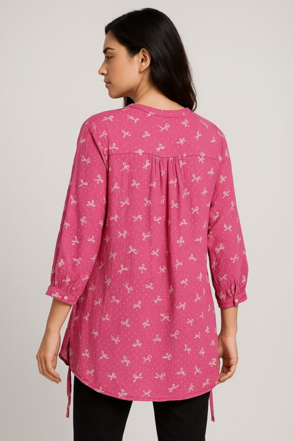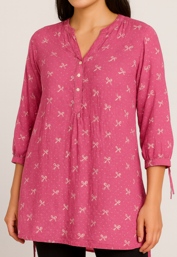 This women's fuchsia tunic top is crafted from soft cotton fabric and features an all-over bow print in light beige. Designed with a split V-neckline and a buttoned front placket, the tunic offers comfort and everyday elegance. The 3/4th sleeves are finished with cuffed hems and side drawstrings for subtle detailing. Its relaxed silhouette and longer length make it a versatile addition to your wardrobe—perfect for casual outings or laid-back workwear.