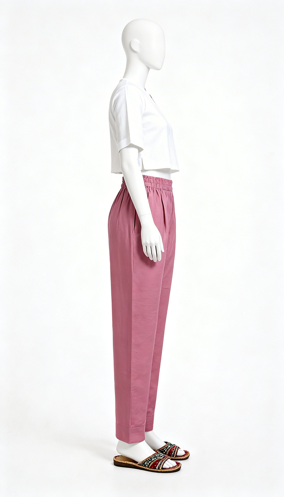 Soft pink tapered pant with breathable fabric and elastic waist, ideal for pairing with kurtas and everyday ethnic wear.