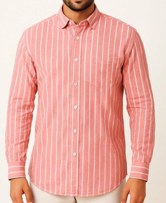 Pink Striped Cotton Shirt, Soft cotton men’s shirt in pink with vertical white stripes, button-down front, full sleeves, and chest pocket for casual styling.