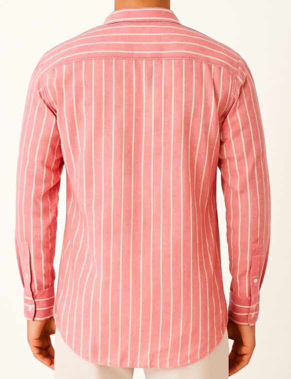 Pink Striped Cotton Shirt, This men's casual shirt features a refreshing pink base with vertical white stripes that add a classic and elongated silhouette. Made from soft, breathable cotton, it includes a standard collar, full button-down placket, and a single chest pocket. The shirt's long sleeves have buttoned cuffs, and the back is designed with a clean yoke and no pleats, maintaining a streamlined appearance. Ideal for casual and semi-casual occasions, it offers both comfort and style with its flattering fit and vibrant hue.