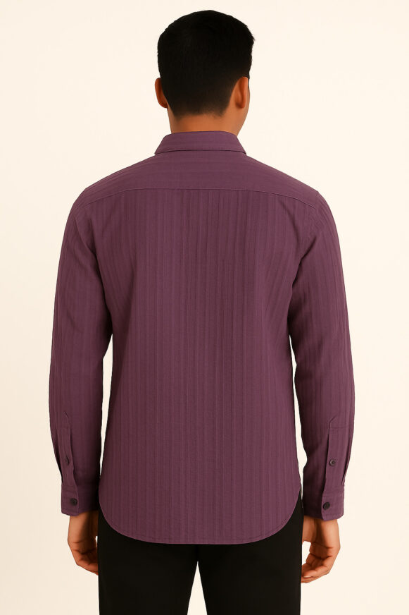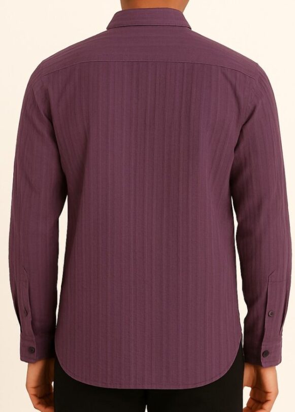 This plum-colored full-sleeve shirt for men features a refined vertical-textured weave and a dual pocket design, blending structure with casual style. The shirt includes two buttoned flap chest pockets, a classic spread collar, and matte-finish buttons. Designed for comfort and functionality, it's perfect for both smart-casual and semi-formal settings. The shirt is crafted from breathable fabric with a soft touch and a structured fit.