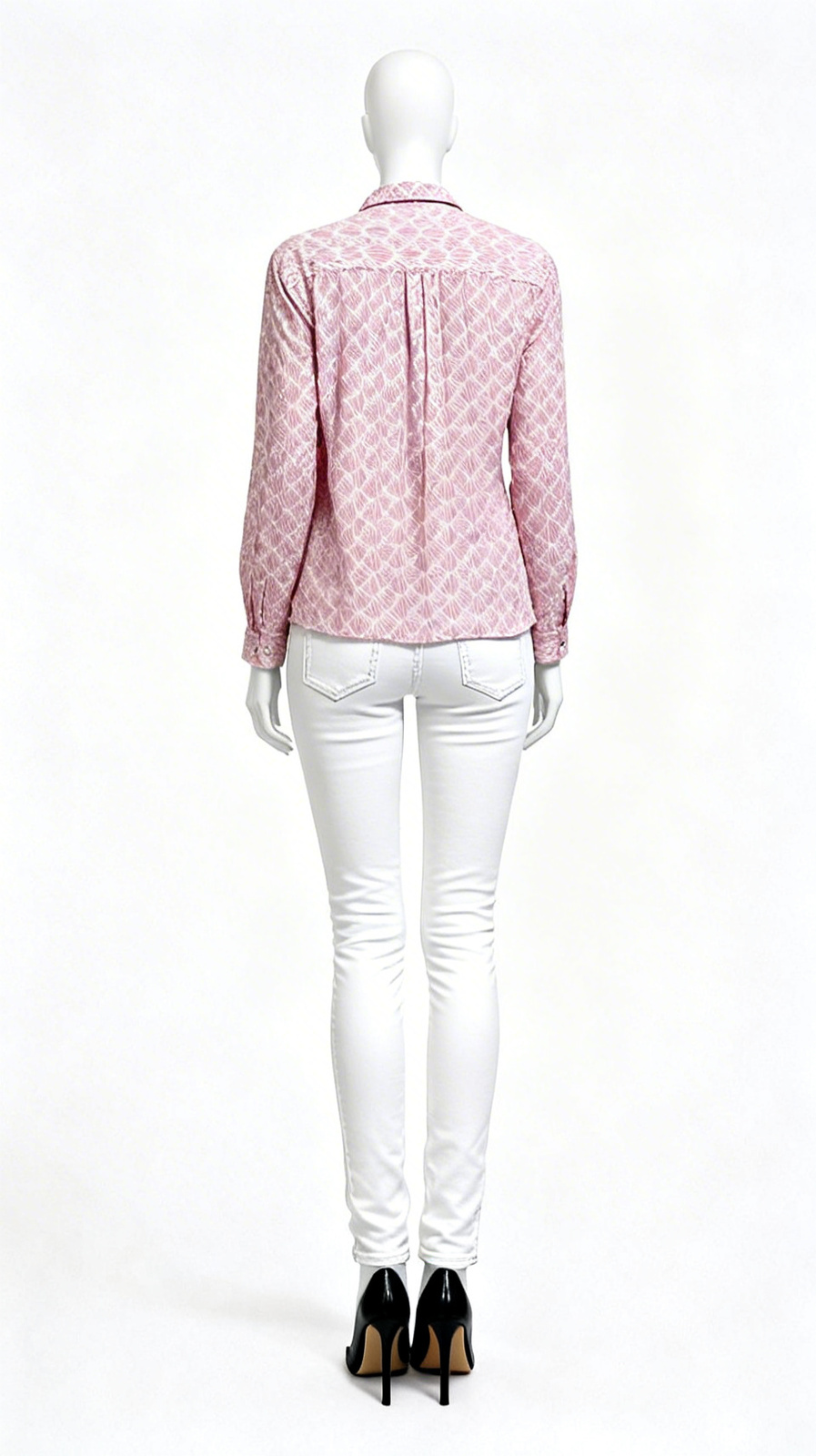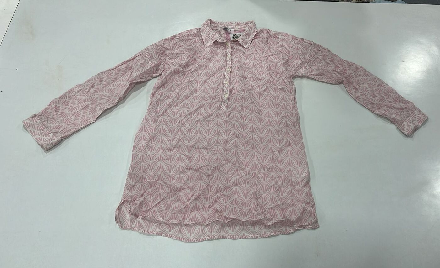 A lightweight pink printed cotton tunic with long sleeves and a partial front button placket