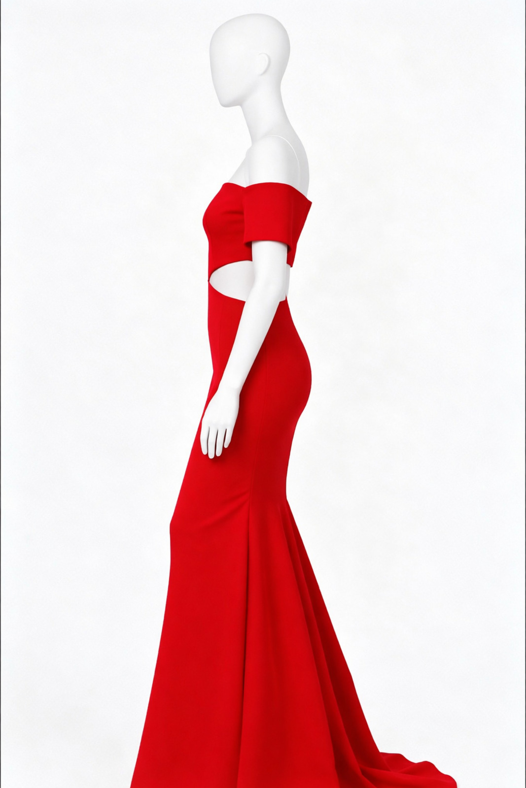 Scarlet Red Off Shoulder Evening Gown sleek contour fit styled for high-impact elegance