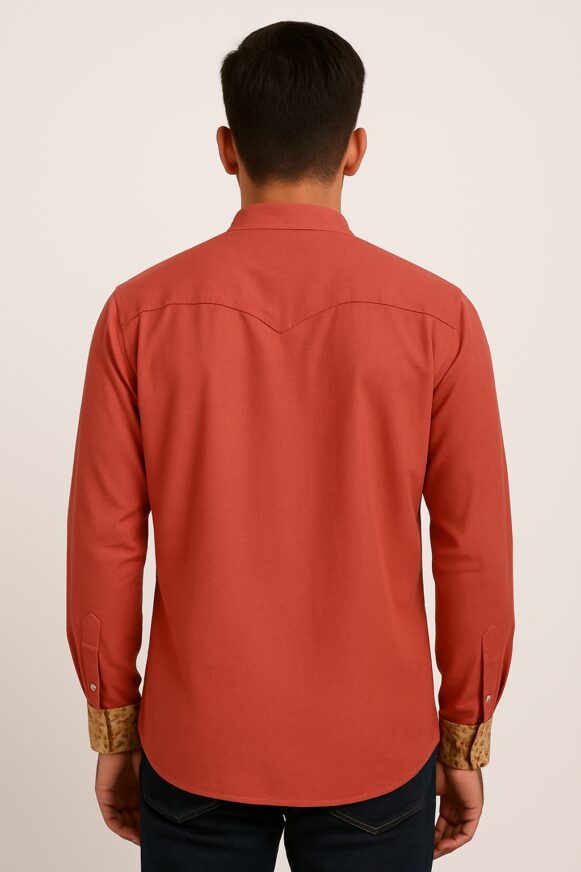 Make a statement with this stylish rust-colored full-sleeve shirt featuring a unique beige floral front panel. Designed with a sleek mandarin collar and detailed floral print, it effortlessly blends traditional charm with modern tailoring. The contrasting solid rust sleeves, collar, and back offer a balanced look. Finished with printed inner cuffs for a refined touch, this shirt is perfect for festive gatherings and smart-casual occasions.