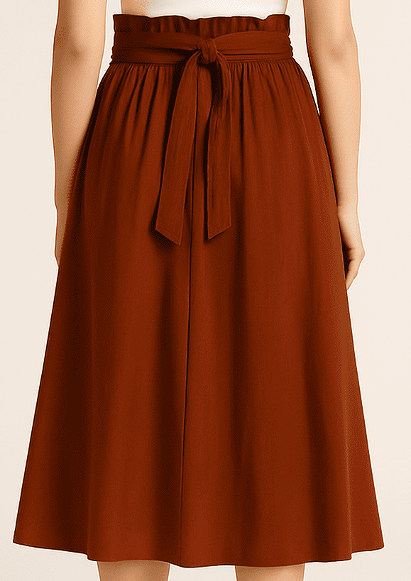 A-line rust brown midi skirt with gathered paperbag waist and tie-up belt for a flattering, comfortable fit.