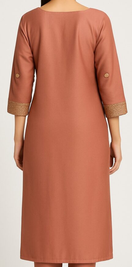 This elegant rust terracotta straight kurta is crafted from a smooth fabric with intricate golden thread embroidery on the neckline, sleeves, and hemline. The kurta features a beautifully embroidered yoke design with vertical geometric motifs cascading down the body, paired with a richly embroidered border for a refined look. Designed with a round V-slit neckline and 3/4th sleeves with embroidered cuffs, this kurta strikes the perfect balance between traditional and contemporary elegance. The subtle sheen fabric enhances the embroidery, making it suitable for festive gatherings, casual outings, and semi-formal occasions.