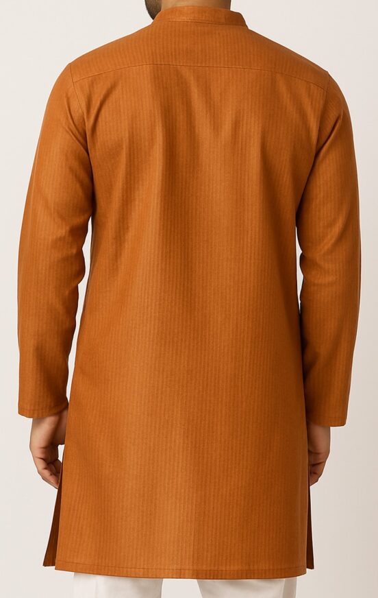 Rust Orange Men’s Textured Kurta, Elevate your traditional wardrobe with this rust orange straight-cut kurta, tailored in a soft blended fabric with subtle vertical self-stripes. Designed for both festive and casual occasions, this kurta features a mandarin collar, a half placket with matching buttons, and side slits for ease. The long sleeves and minimal detailing make it a versatile pick that can be paired effortlessly with white or beige churidar, pyjamas, or trousers. The back showcases a clean design with a stitched yoke and uniform texture throughout.