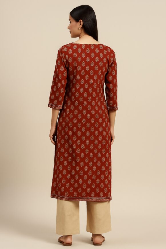 Elevate your everyday ethnic wear with this rust red straight kurta set featuring an elegant beige floral block print. The kurta has a round split neckline enhanced with delicate thread detailing and 3/4th sleeves. Paired with comfortable beige palazzos, this ensemble is perfect for casual outings, office wear, or festive occasions. Made from breathable cotton-blend fabric, it ensures comfort with style.