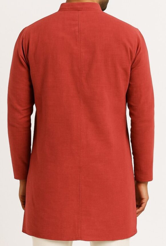 Elevate your ethnic wardrobe with this rust red cotton kurta crafted from a soft, breathable fabric. Designed with a modern mandarin collar and half-button placket, it features a neat chest pocket and a straight hemline. The full sleeves and comfortable fit make it ideal for both festive and casual occasions. The back displays a clean panel with no embellishments, keeping the look minimal and refined.