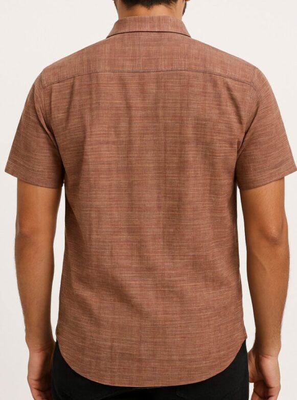 Rustic woven casual shirt, Rust brown woven-texture shirt with button-down front and short sleeves, perfect for smart-casual wear.