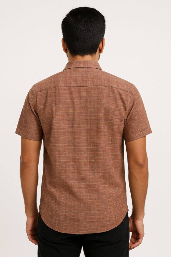 This short-sleeve casual shirt is crafted from lightweight, breathable cotton with a rustic, multi-thread woven texture. The fabric features a unique blend of maroon, brown, white, blue, and yellow threads in a subtle grid pattern. It includes a spread collar, front button placket with white buttons, and a neatly placed left chest pocket. The straight yoke on the back adds a clean, tailored touch. Ideal for warm weather or casual layering.