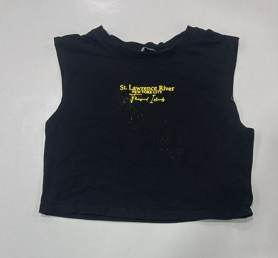 A black solid sleeveless crop top featuring printed text detail