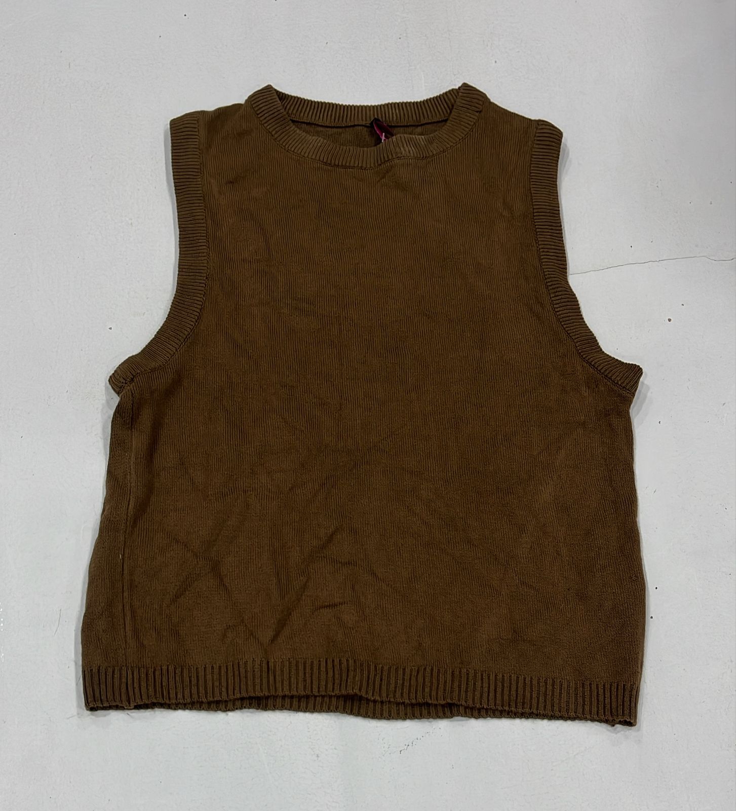 A sleeveless knit top with a round neckline and ribbed detailing.