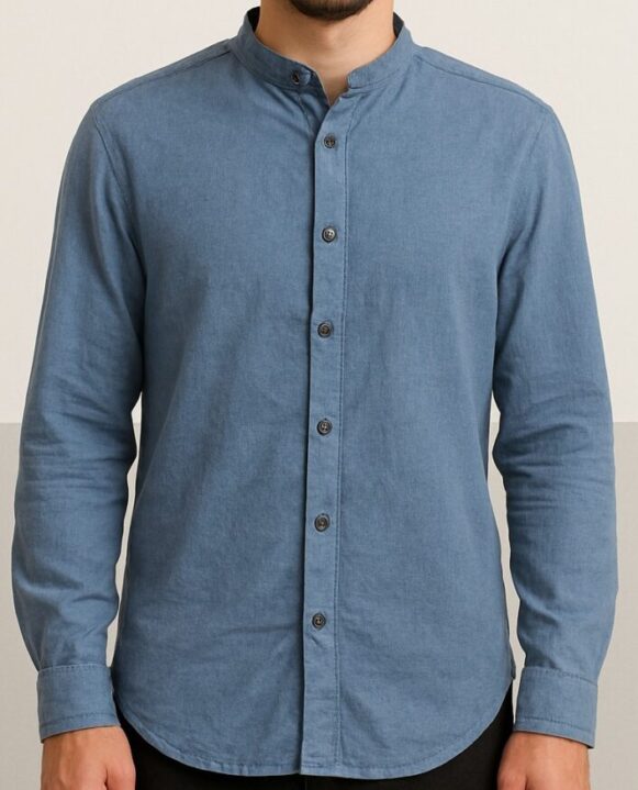 This men’s full-sleeve shirt features a sleek mandarin collar and a clean, button-down front design, offering a modern yet versatile look. Crafted from a soft, breathable cotton fabric in a stylish steel blue shade, it provides all-day comfort while maintaining a polished appearance. The shirt includes a slightly curved hemline for easy tucking or untucked styling, buttoned cuffs, and precise stitching for added durability. Ideal for casual outings, office wear, or semi-formal occasions.